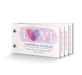 Die Save The Date Karte Love stellt das Symbol der Liebe auf ganz besondere Weise dar. Zwei Fingerabdrücke in zwei verschiedenen Farben als Herz zusammengesetzt zeigt wie innig Sie miteinander verbunden sind. Eine ansprechende moderne Vorlage die zur Gestaltung Ihrer persönlichen Save The Date Karten gerade zu einlädt.